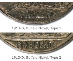 The Buffalo nickel Type 1 lasted less than a year while the populous Type 2 coin design remained until the very end of Buffalo nickel series, which was 1938.