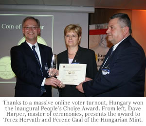 This year for the first time a People’s Choice Award was selected by more than 100,000 coin enthusiasts worldwide, who voted online at NumisMaster.com. The award goes to the Hungarian Mint for its copper-nickel 50-forint that commemorates the 50th anniversary of the 1956