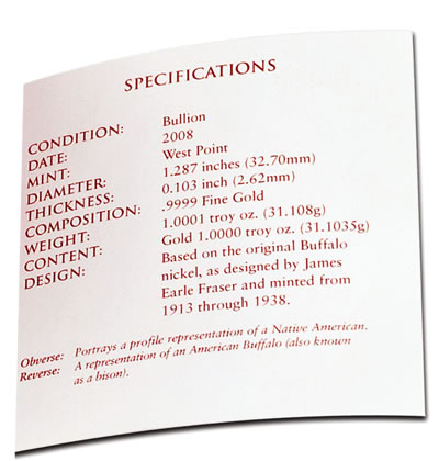 The American Buffalo 2008 coin celebrates the 2008 Lunar New Year – a traditionally important gift-giving time of year for Asian-Americans. It contains one ounce of 24-karat, .9999 fine gold.