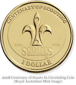 The new Scouts commemorative dollar will enter circulation and join the standard one dollar five kangaroo coin starting in April of 2008. Both coins are exactly the same with the exception of the reverse design.