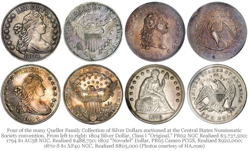 Dallas, TX. The 1804 Silver Dollar highlighting the amazing collection of silver dollars assembled by David Queller and his family reached $3,737,500 at the Official Auction of the Central States Numismatic Society convention held by Heritage Auction Galleries. Combining the rare coin and currency results, total prices realized currently exceed $42.6 million. After adding proceeds from all Post Auction Buys and Final Session auctions, total prices are expected to exceed $44 million.