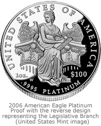 2006 began the new platinum three-year coin series entitled “The Foundation of American Democracy,” which celebrates the branches of government with a new reverse or tails design every year.