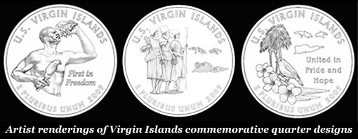 Artist renderings of three Virgin Islands commemorative quarter designs have been prepared by the United States Mint and sent back to the Office of the Governor for review. U.S. Virgin Island residents can vote for their favorite design online or by mail-in ballot. Voting ends Friday, June 13.