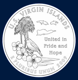 The "V.I. Beauty" quarter designs is a geographical rendition of the Virgin Islands, which includes the 3 major islands, and the official bird of the Virgin Islands.