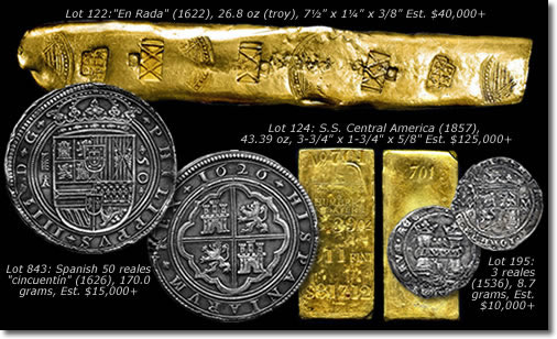 A California Gold Rush-era gold ingot from the S.S. Central America (1857) estimated at $125,000+ and also a gold bar marked with the "En Rada" stamp (Peña-Randa) from the Atocha (1622) estimated at $40,000+;