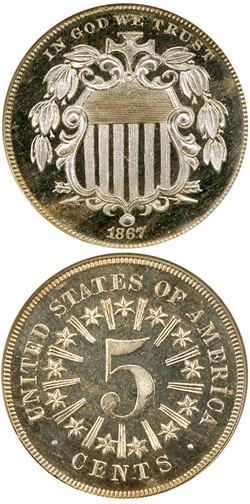 Lot 250 1867 Shield Nickel. Rays. Proof-66 Cameo (NGC).