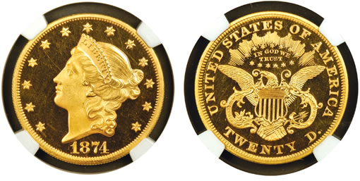 Lot 1340 1874 Liberty Double Eagle. Proof-64 * Ultra Cameo (NGC). CAC.