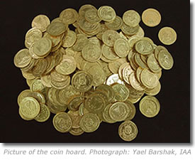 According to Dr. Doron Ben-Ami and Yana Tchekhanovets, directors of the excavation at the site on behalf of the Israel Antiquities Authority, "Since no pottery vessel was discovered adjacent to the hoard, we can assume that it was concealed inside a hidden niche in one of the walls of the building. It seems that with its collapse, the coins piled up there among the building debris."