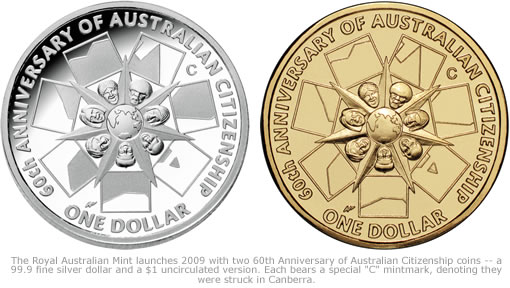 The Royal Australian Mint launched 2009 by celebrating sixty years of the enactment of the Australian Citizenship Act 1948 with the release of a proof silver dollar and an uncirculated $1 coin.