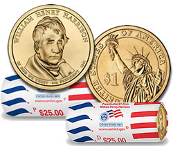 25-coin rolls of 2009 William Henry Harrison Presidential $1 Coins are now on sale at the United States Mint for $35.95, plus $4.95 for shipping and handling.