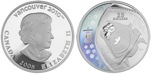 Designed by Canadian artist Glenn Green of Vancouver, BC, the bobsleigh circulation coin features a four member bobsleigh team and their sled in the centre, a stylized maple leaf and the words ‘Vancouver 2010′. The obverse features the portrait of Her Majesty Queen Elizabeth II, rendered by Susanna Blunt.