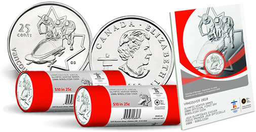 Up to 22 million 25-cent bobsleigh coins will enter into circulation today, June 23, 2009 and be available exclusively at RBC branches and participating Petro-Canada locations. RBC is a Premier National Partner and Petro-Canada is a National Partner of the Vancouver 2010 Olympic and Paralympic Winter Games. Canadians can also look for these special coins in their change. Participating Petro-Canada locations will also sell bobsleigh sport cards, containing a uniquely painted version of the coin, for $7.95.