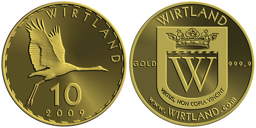 Wirtland has released its first gold coin, the "Wirtland Crane". "Wirtland Crane" is considered to be the world’s first gold coin produced by an internet-based (virtual) country.