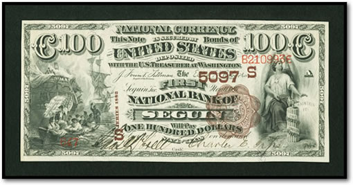 A Seguin, TX – $100 1882 Brown Back Fr. 528 The First NB Ch. # (S)5097 one of two large publicly held; Carmen, OT – $10 1902 Red Seal Fr. 613 The First NB Ch. # (W)6719 unique Serial Number 1 and new to the census; Camden, AR – $50 1882 Brown Back Fr. 512 The Camden NB Ch. # (S)4066; Lake Arthur, NMT – $10 1902 Red Seal Fr. 615 The First NB Ch. # (W)8584 one of only three notes known on the bank; Havana, NY – $5 1875 Fr. 401 The Havana NB Ch. # 343 unique for the bank and location; Sausalito, CA – $10 1902 Plain Back Fr. 635 The First NB Ch. # 12453 first ever public offering; Fairbanks, AK – $5 1902 Red Seal Fr. 587 First NB Ch. # (P)7718 rare Alaska Red Seal, and San Francisco, CA – $20 1875 Fr. 436 The First NB Ch. # 1741, one of less than 10 known 1875 $20 National Gold Bank Notes.