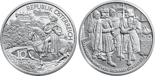 The Austrian Mint in Vienna is issuing the second coin in its €10 silver commemorative series "Tales and Legends in Austria". The theme of the new coin is the captivity of the English king, Richard I, on his homeward journey from the Third Crusade in 1192 and the legend of his loyal friend and troubadour who is said to have discovered in which castle the king was being held.