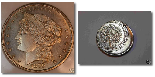 This pattern 1879 silver dollar and off-center 1929 5 Reichsmark silver coin are two from the over 1,000 coins stolen from PNG member-dealer Julian M. Leidman