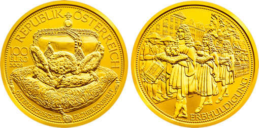 The maximum mintage for this new issue is 30,000 pieces worldwide. Each coin comes in an attractive box accompanied by a numbered certificate of authenticity and a gold-plated lapel pin in the form of the archducal crown. A prestigious case for the whole collection of five coins may be acquired separately.