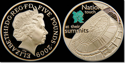 The 2009 Royal Mint Big Ben £5 Crown is an official Licensed Product of London 2012, highlighting the achievements, physical character and identity of Great Britain in the lead up to the great event. The clock face of the Palace of Westminster on this coin symbolises democracy and the key role Britain has played through its Parliament in bringing democracy to the world. The ‘Nations touch at their summits’ quotation, is a way of referring to the Olympic Games and Paralympic Games as the pinnacle of sporting achievement.