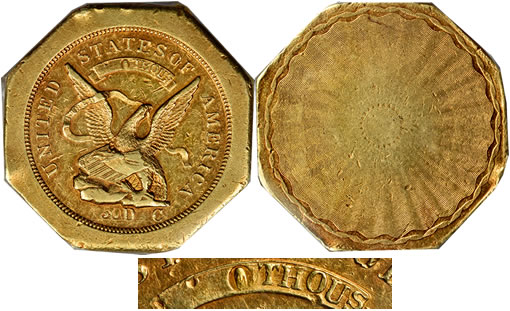 Among the leading rarities in the Orlando Rarities Sale, this 1851 Augustus Humbert Fifty-Dollar gold piece features a previously unknown engraving error. Notice the missing digits 88 in the inscription 880 THOUS, highlighted best in the partial image of the obverse at bottom. (Click Image to Enlarge.)
