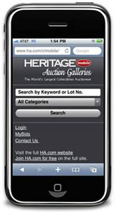 DALLAS, TX — Heritage Auctions has announced the launch of a mobile version of its award-winning Website, www.HA.com. Collectors now have the opportunity to search for, view and bid on any lot in any current Heritage auction from most any mobile device with a web browser from anywhere in the world where there’s Web service.