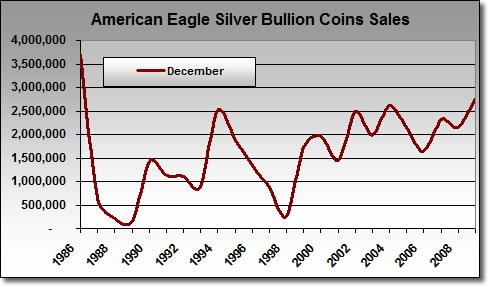 2,773,500 American Silver Eagle Bullion Coins were sold during the final weeks in 2009, according to the latest United States Mint sales data. Last month ranked as the second best December ever for the silver coin series that was introduced in 1986. It was the fourth best month in 2009 — a year that saw a record-breaking 28,766,500 eagles fly out of US Mint inventories.