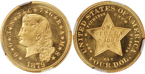 This 1879 Judd-1635 Flowing Hair Stella certified Proof-66 Cameo by NGC realized $182,500 – CLICK IMAGE TO ENLARGE