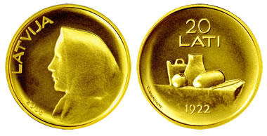 The new Coin of the Year topped the Best Gold category. It is a 20 lati issued by the Bank of Latvia. It marks the 15th anniversary of the renewal of the lats currency after Latvia regained independence from the old Soviet Union. The original design was created in 1922 by Teodors Zalkalns but never used.