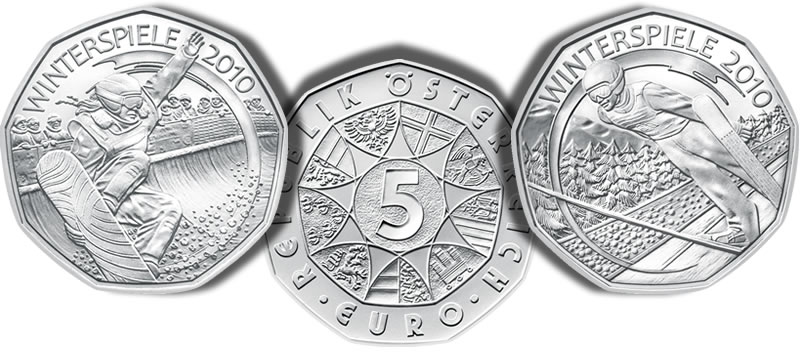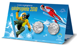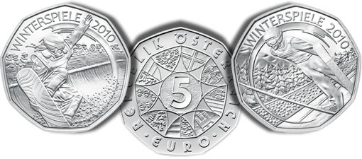 To celebrate the Winter Games, the Austrian Mint in Vienna has issued two silver 5 Euro coins. Each displays a winter discipline in which Austria is a world-leading performer.