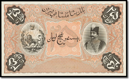 This Iranian 25 Tomans banknote is one of many International currency highlights in the upcoming Ponterio & Associates March 2010 Baltimore Auction. (Click Image to Enlarge)