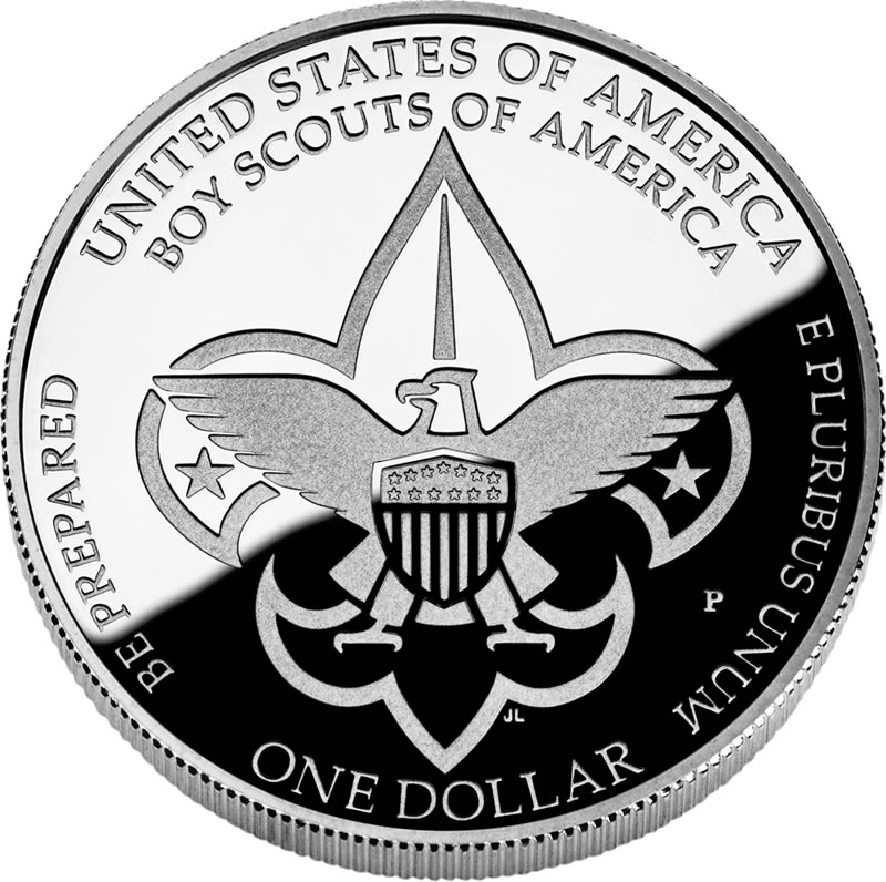 Jim Licaretz engraved the universal emblem of the Boy Scouts of America which is featured on the reverse. Surrounding that emblem are the inscriptions UNITED STATES OF AMERICA, BOY SCOUTS OF AMERICA, BE PREPARED, E PLURIBUS UNUM and ONE DOLLAR.