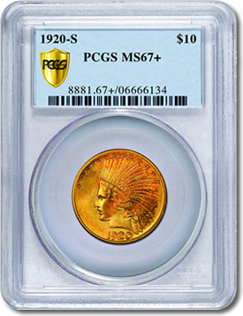 This 1920-S Indian $10, graded PCGS Secure Plus MS67+, is the finest known and one of the highlights of the Simpson Collection, the all-time finest set of Indian Head Eagles in the PCGS Set Registry. (Photo credit: PCGS) – CLICK TO ENLARGE