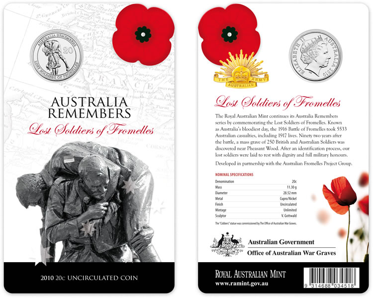 "On July 19 2010, the last soldier will be reburied and the new Fromelles (Pheasant Wood) Military Cemetery will be officially opened. It is a great honour and very appropriate to have this commemorative 20c coin released by the Royal Australian Mint," said Lieutenant Colonel James Brownlie.