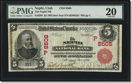 A newly discovered Nephi, UT – $5 1902 Red Seal Fr. 589 The Nephi NB Ch. # (P)8508 PMG Very Fine 20 that becomes the finest known Utah Red Seal is among the highlights found in the Session Three material.