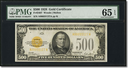 Small Size Notes, Error Notes, and Large Size Notes will be featured during Session Two beginning on Friday, June 18 at 6 p.m. CST. Among the Small Size selections are newly discovered $5,000 and $10,000 Federal Reserve Notes from the Dallas district Fr. 2221-K $5000 1934 LGS FRN Note PMG Very Fine 30 and Fr. 2231-K $10000 1934 FRN PCGS Apparent Very Fine 25, and a gorgeous Fr. 2407 $500 1928 Gold Certificate PMG Gem Uncirculated 65 EPQ.