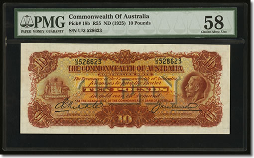 Featured lots include: Australia Commonwealth of Australia £10 ND (1927) Pick 18b R55 PMG Choice About Unc 58, Hawaii Republic of Hawaii Silver Certificate of Deposit $10 1895 (1897) Pick 12a PCGS Fine 12, and a Palestine £10 Palestine Currency Board 1929 Pick 9b PMG Choice Very Fine 35.
