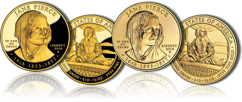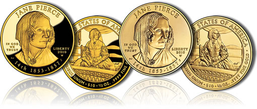 The 2010 First Spouse Gold Coin designs were revealed back in December 2009 by the US Mint. A solemn portrait of Jane Pierce is featured on the obverse of her coin surrounded by the inscriptions JANE PIERCE, 14TH 1853-1857, IN GOD WE TRUST, LIBERTY and 2010.