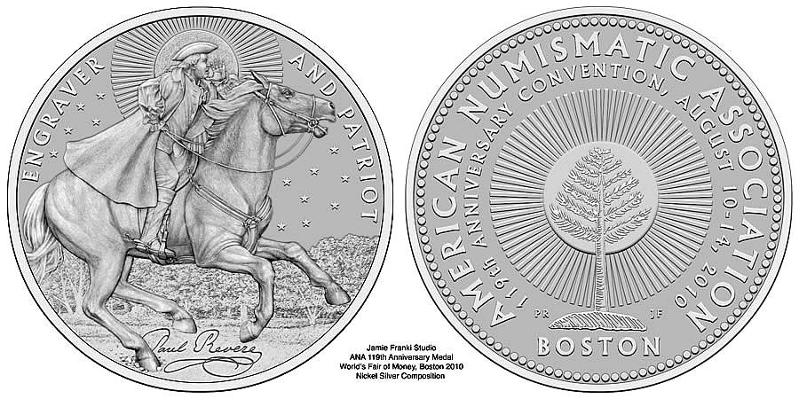 This design anchors the legend for the ANA 119th annual convention. Two sets of initials attribute the design of the medal to Paul Revere and Franki. A border of 119 beads and a rim completes the composition.