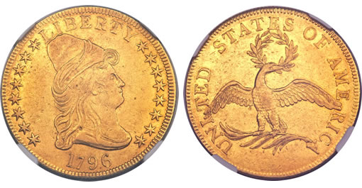 The top gold highlight of the auction was an important 1796 $10 AU53 NGC, Breen-6832, Taraszka-6, BD-1, R.4, which realized $57,500.