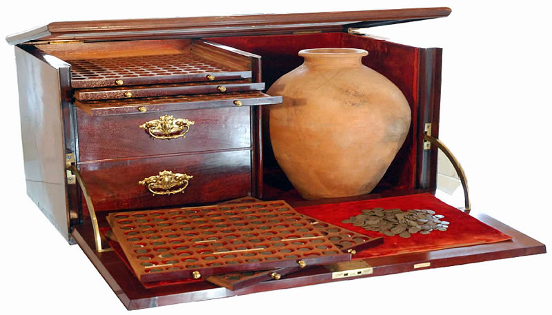 1152 Ancient Coins. Roman Coins From The Bishop’s Wood Hoard. Brazilian Mahogany Cabinet, purpose-built by Spink & Son, drop-front, bevelled-glazed lifting lid, with two interior compartments, the left with five coin trays, each with the capacity to hold 100 coins, and two deeper drawers, the right with space to house the pot; the cabinet on stand with carved claw-and-ball feet; cabinet dimensions 70cm x 36cm x 38cm; together with the heavily reconstructed pot, not of local (possible east Midlands) manufacture, that contained the hoard; also with offprints of the articles by Mary Bagnall-Oakeley, Numismatic Chronicle, vol XVI, 1896, pp.209-237, and Transactions of the Bristol and Gloucestershire Archaeological Society, vol.XIX, 1895, pp.399-420, the latter including the author’s handwritten list of institutions that had received parcels of coins from the hoard, dated March 1898.