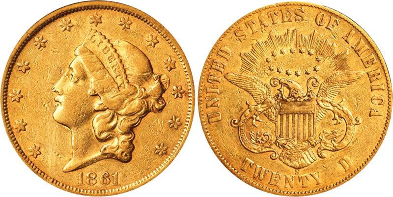 An important and rare one-year type, the 1861-S Paquet features an experimental reverse that proved unsuitable for regular issue production and widespread circulation. The San Francisco Mint struck only 19,250 examples of this issue before returning to the traditional Liberty Double Eagle reverse design by Chief Engraver James Barton Longacre.