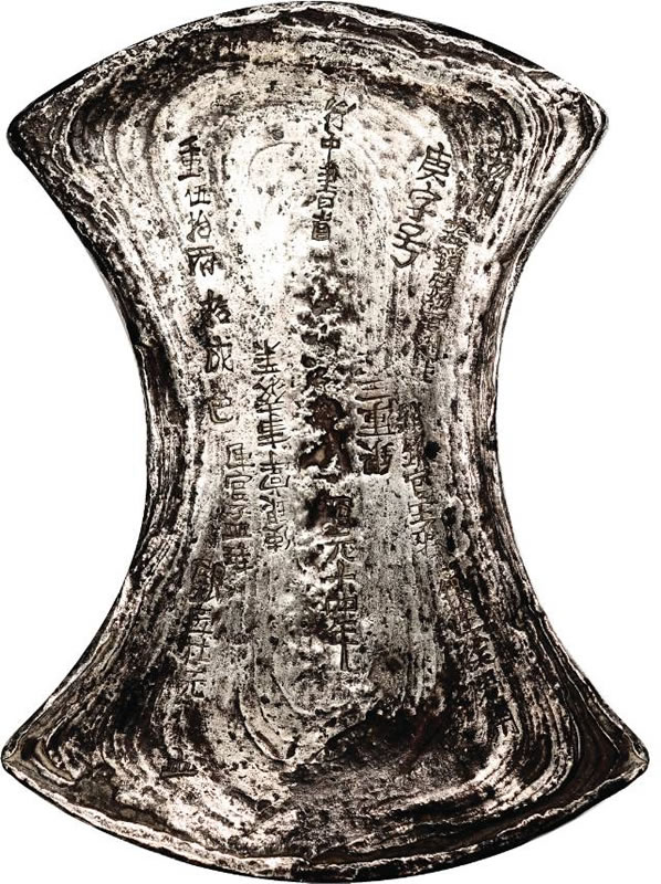 This Khubilai Khan 50 Tael Ingot realized $64,900 at the 2010 Baltimore Auction. Dated the 14th year of the Zhiyuan era, it is inscribed with the denomination at upper left and ruler’s name and date at lower center. It is among the earliest known Chinese 50 Tael Sycee ingots.