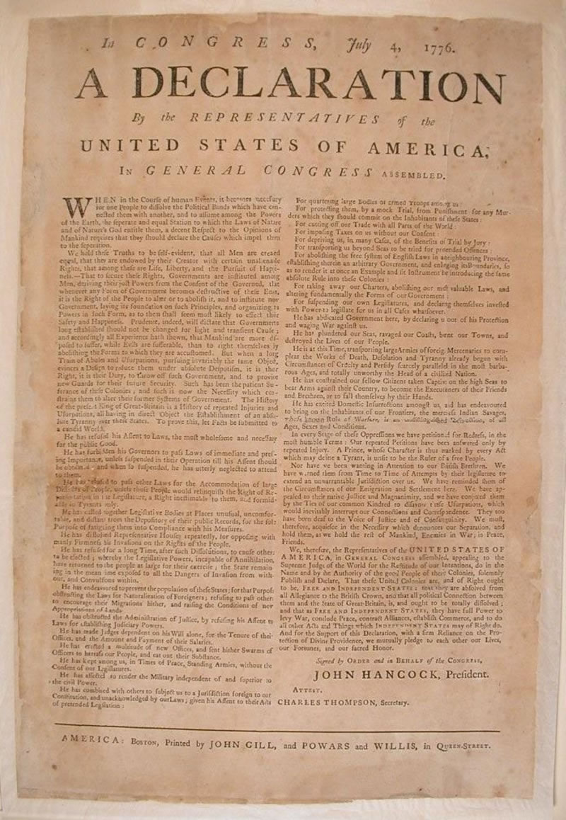 one of the few known surviving broadsides of the Declaration of Independence printed in Boston circa July 17, 1776 by printers Gill, Powars and Willis;