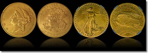 The 1861 Philadelphia Mint “Paquet Reverse” gold $20, graded NGC MS67, was formerly in the famous Farouk and Norweb collections. Not known to exist until 2006, the gem proof 1921 Saint-Gaudens Double Eagle, graded NGC SP64, is insured for $8 million. Both rare coins will be displayed at the ANA World’s Fair of Money in Boston courtesy of Brian Hendelson of Classic Coin Co. (Photos courtesy of Numismatic Guaranty Corporation.) – Click image to enlarge