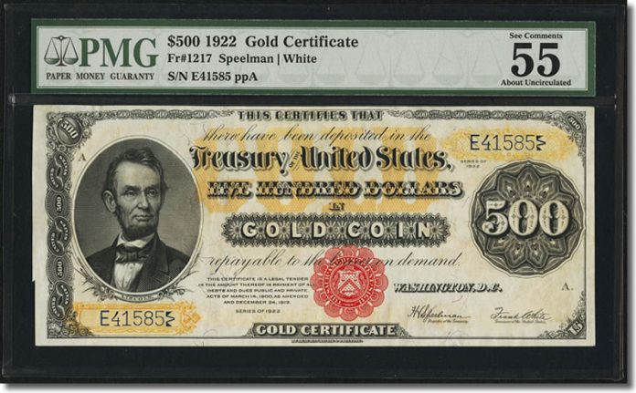 The final portion of Session Three features Large Size Type Notes. A stunning Fr. 1217 $500 1922 Gold Certificate PMG About Uncirculated 55 EPQ is among the featured items. The spectacular note earned "Exceptional Paper Quality" and "Great Margins & Color" comments from the grading service and is one of the finest known examples.
