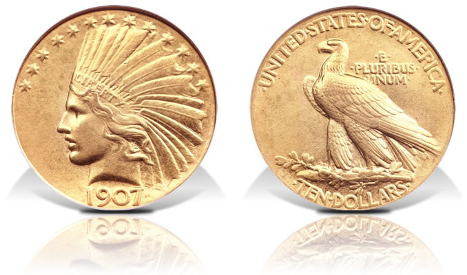 The coinage designs would be the artist’s final masterpieces. In July 1907, when Saint-Gaudens was going through the last stage of his terminal cancer, two early examples of the ten dollar coin were struck. The edges of these two coins were plain; later Wire Rim 1907 ten dollar coins have an edge design of 46 stars.