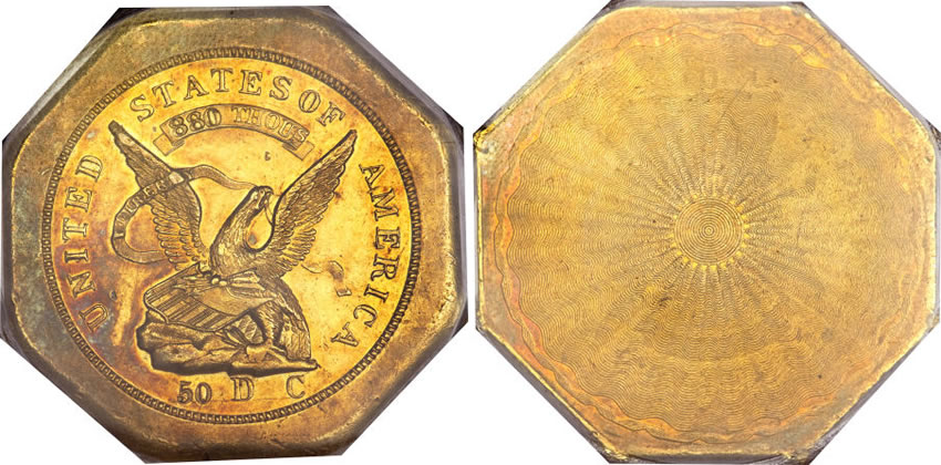 The amazing Humbert Fifty, an Eliasberg cover coin from the May 1996 sale of that famed collection, is perhaps the most stellar example of these time-consuming, difficult to produce coins — made in "hand-crafted style," to borrow the Eliasberg catalog’s phrase — whose dies were originally created for flexibility in value, explaining the enigmatic "C" for "Cents" in the denomination, yet which proved, in practice, to be dominated in production by the $50 denomination dominated.