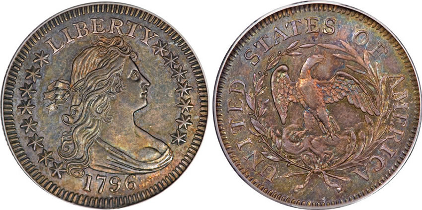 The 1796 quarters were the first of their kind, featuring the Draped Bust obverse modeled from the work of Gilbert Stuart, and the Small Eagle reverse that would soon be replaced with a Heraldic Eagle design. These are one-year type coins, the first quarter dollars ever minted, with a low-mintage issue and scarce a dozen examples thought to still exist.