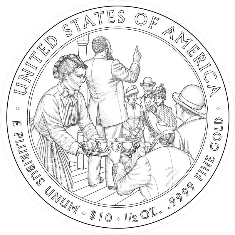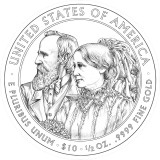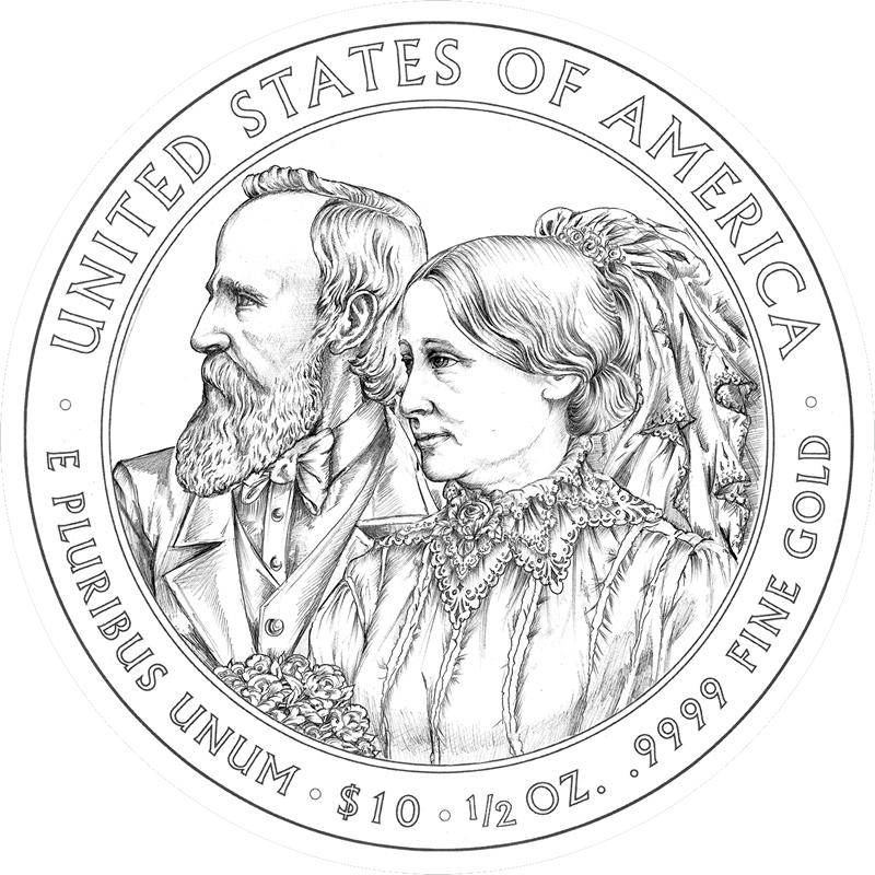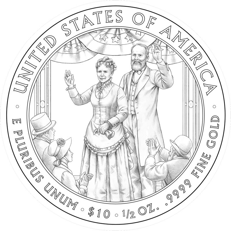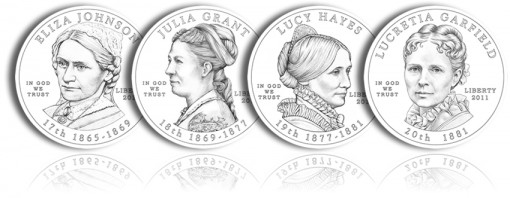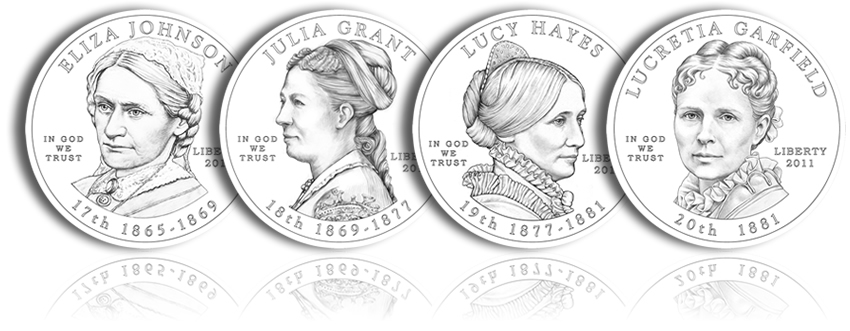 The one-half ounce, 24 karat gold coins that debuted in 2007 continue into 2011 by honoring the spouses of the 17th through 20th Presidents of the United States — Andrew Johnson, Ulysses S. Grant, Rutherford B. Hayes and James A. Garfield.