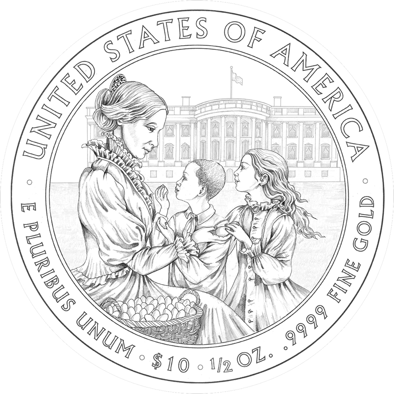 The obverse of each $10 denominated coin portrays a former First Lady while its reverse depicts a significant moment or aspect of their lives. The 2011 gold pieces will feature themes for Eliza Johnson, Julia S. Grant, Lucy Hayes, and Lucretia Garfield.