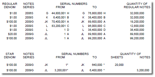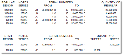 The BEP also produced a number of $20 and $100 star notes, as depicted by the "*" reference in the above images. Star notes are replacements for misprinted notes or certain serial numbers, like 000 000 000. As they are rarer, money collectors generally find them more desirable.